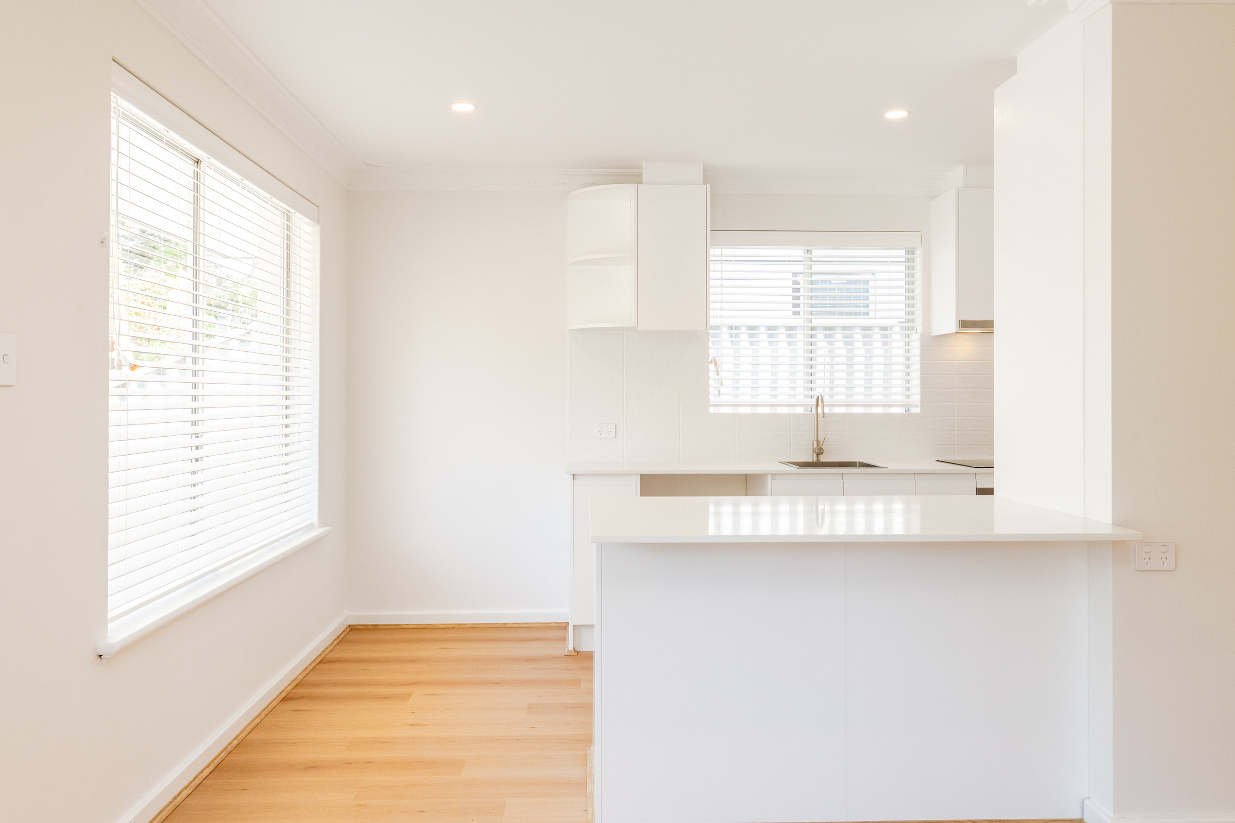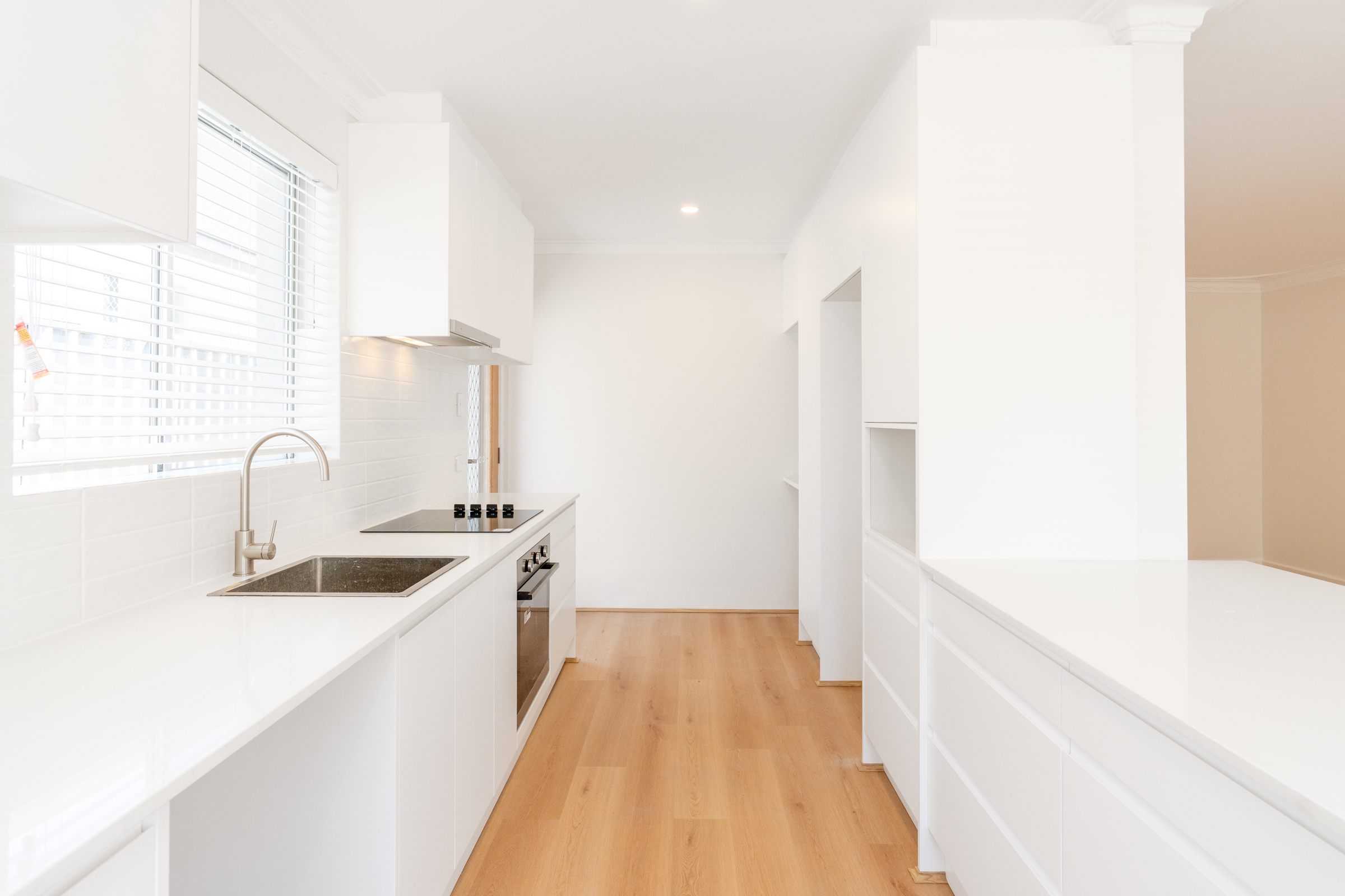 • Kitchen with stone benchtops, overhead cupbaords, dishwasher space and deep stainless steel sink