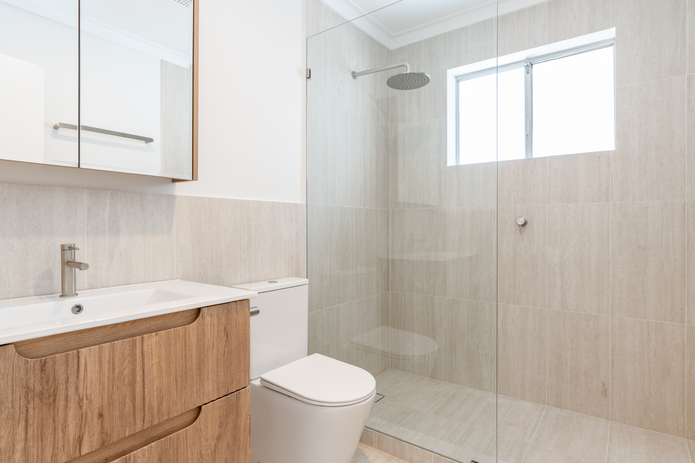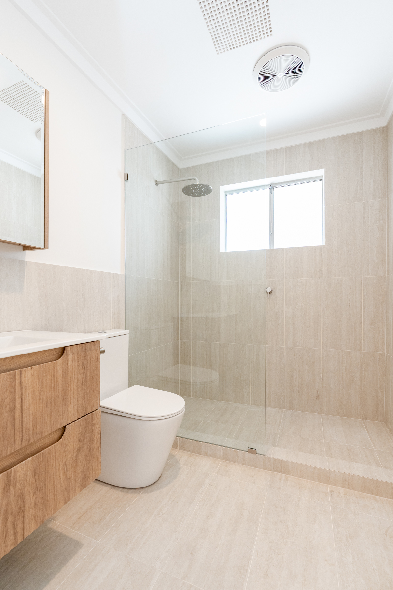 • Bathroom with floor to ceiling tiling, double sized shower recess