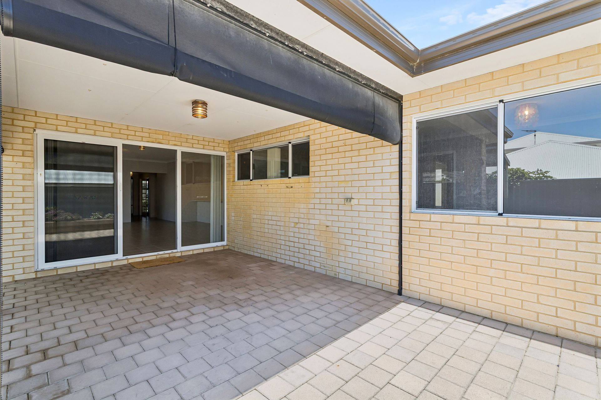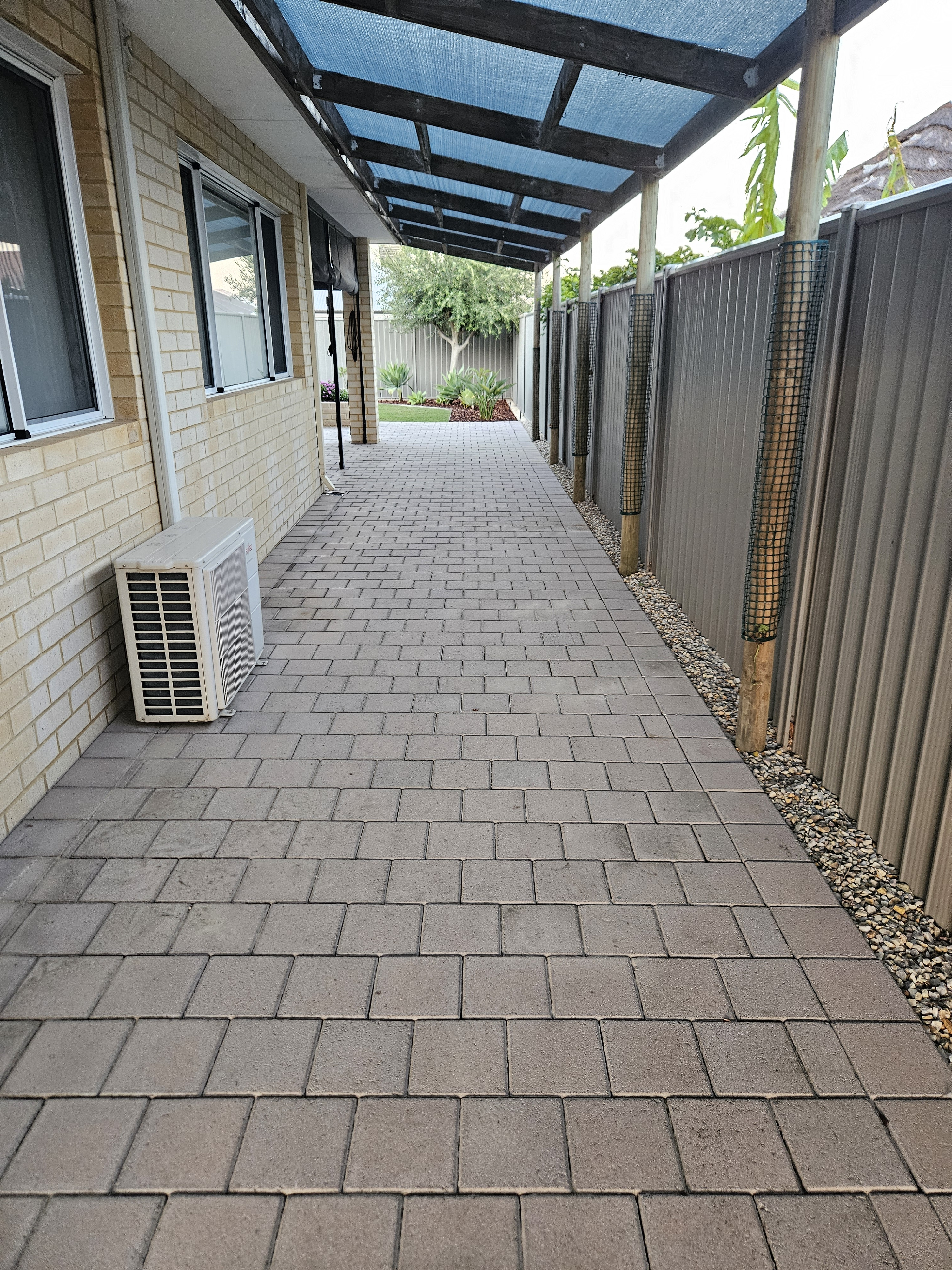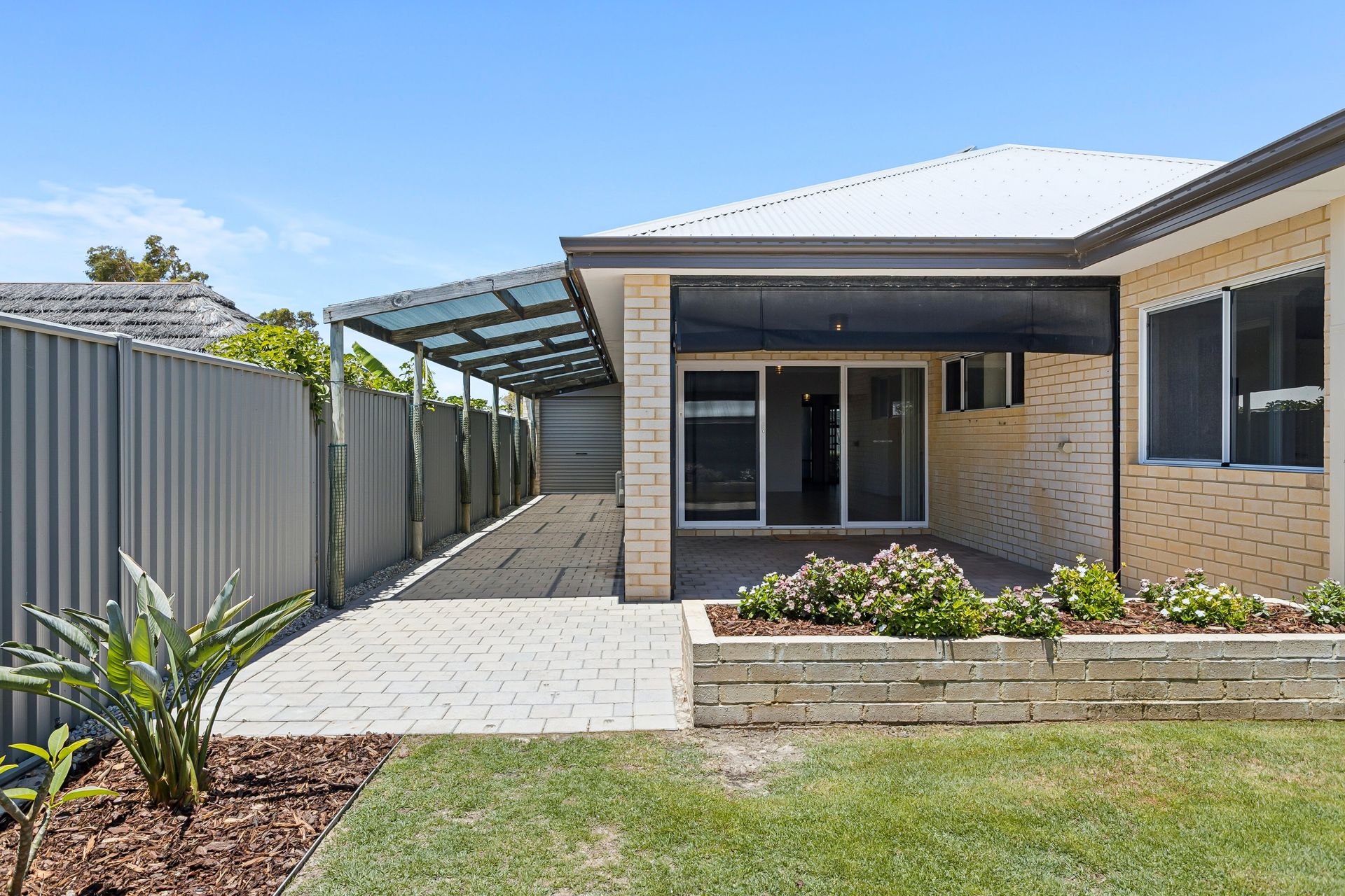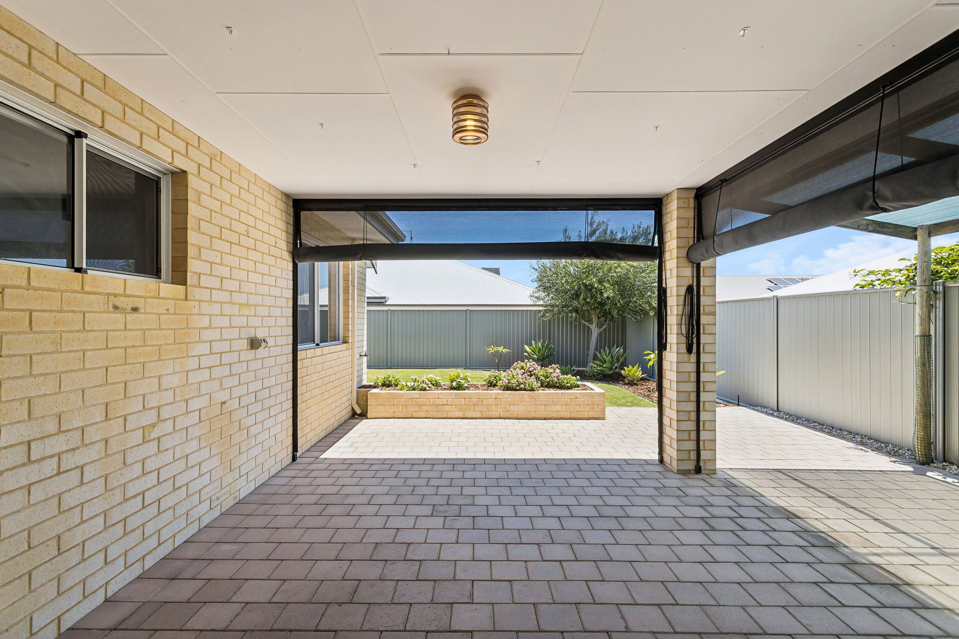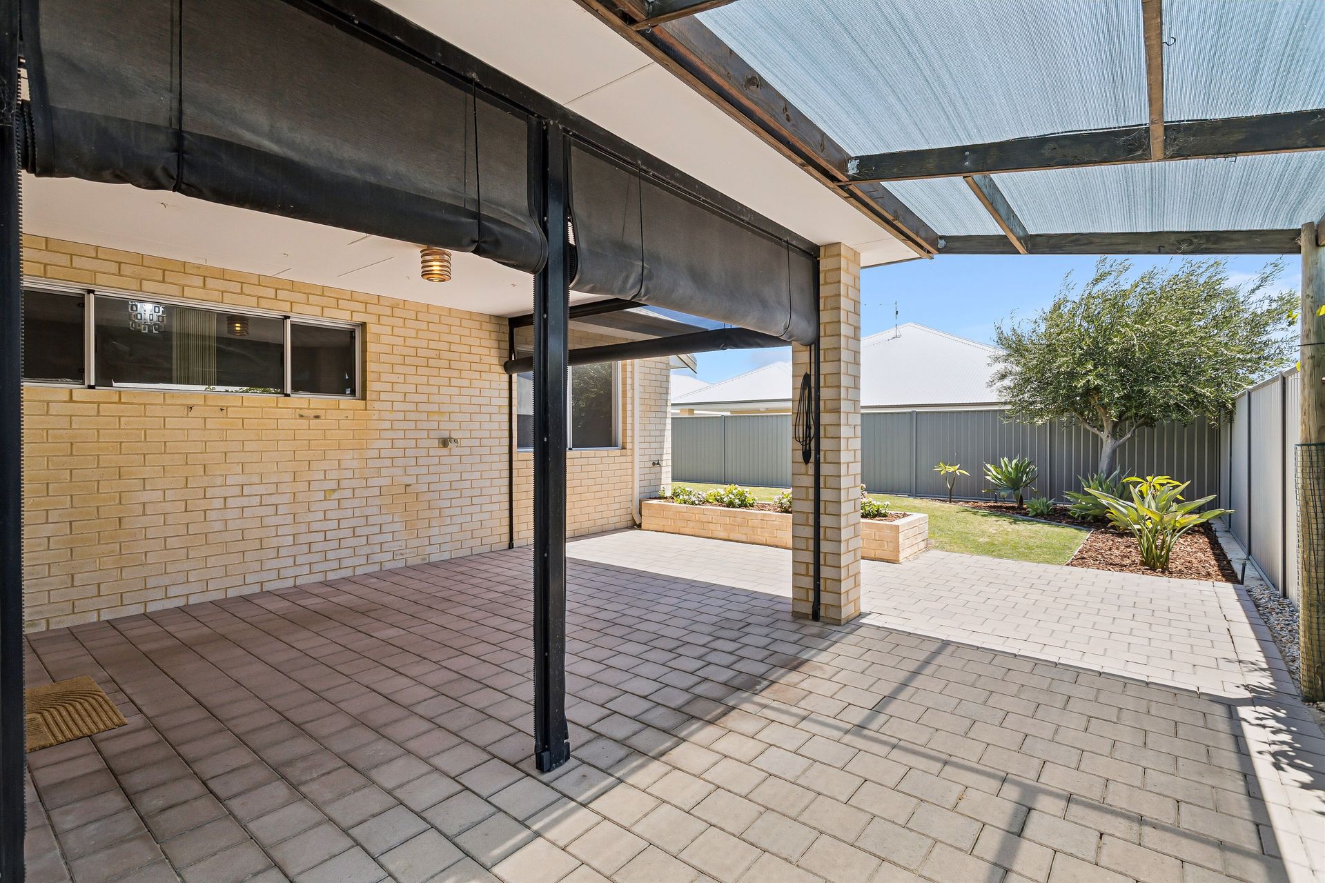 • Alfresco area with cafe bilnds and another pergola shaded area through to the garage