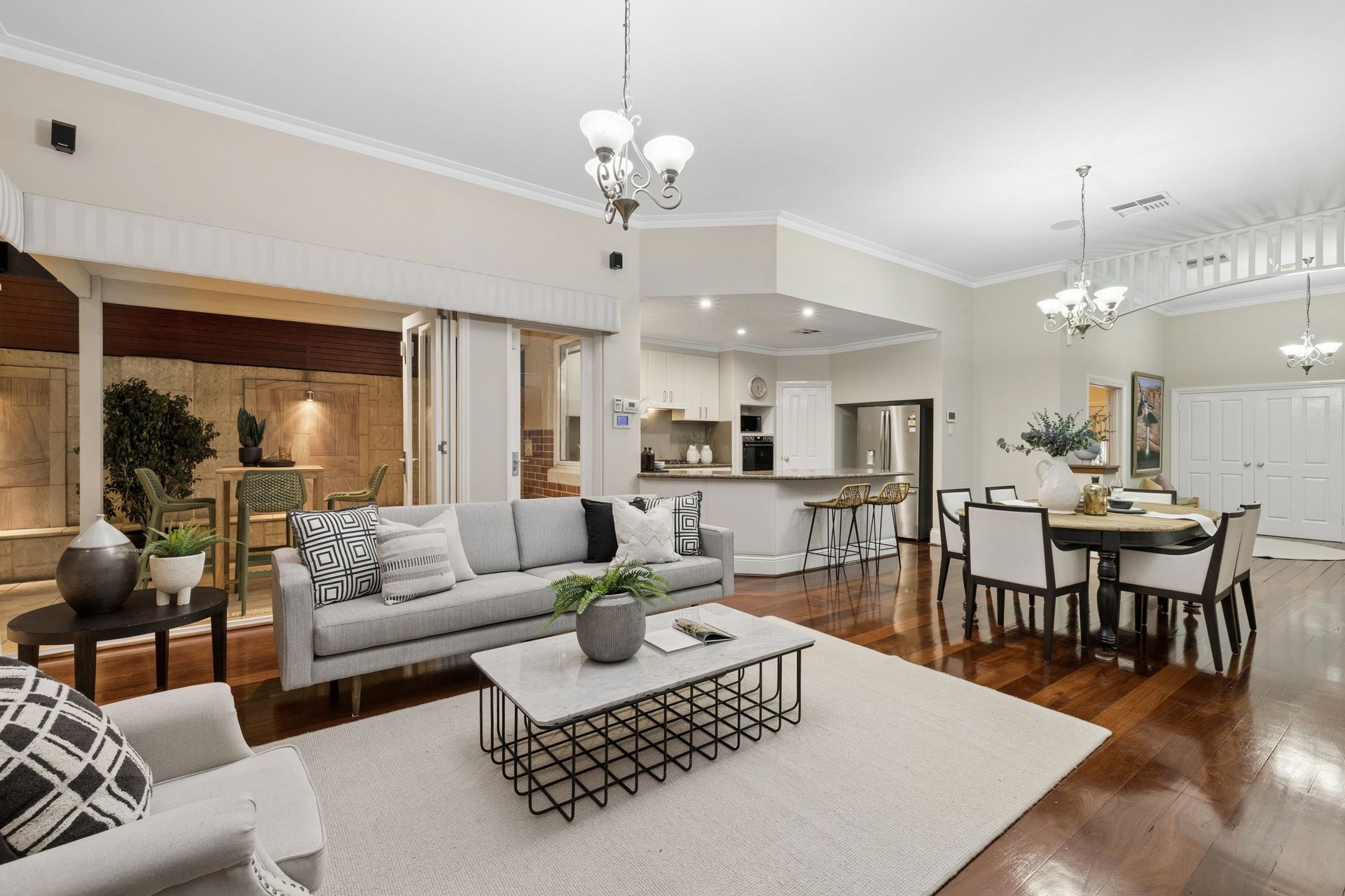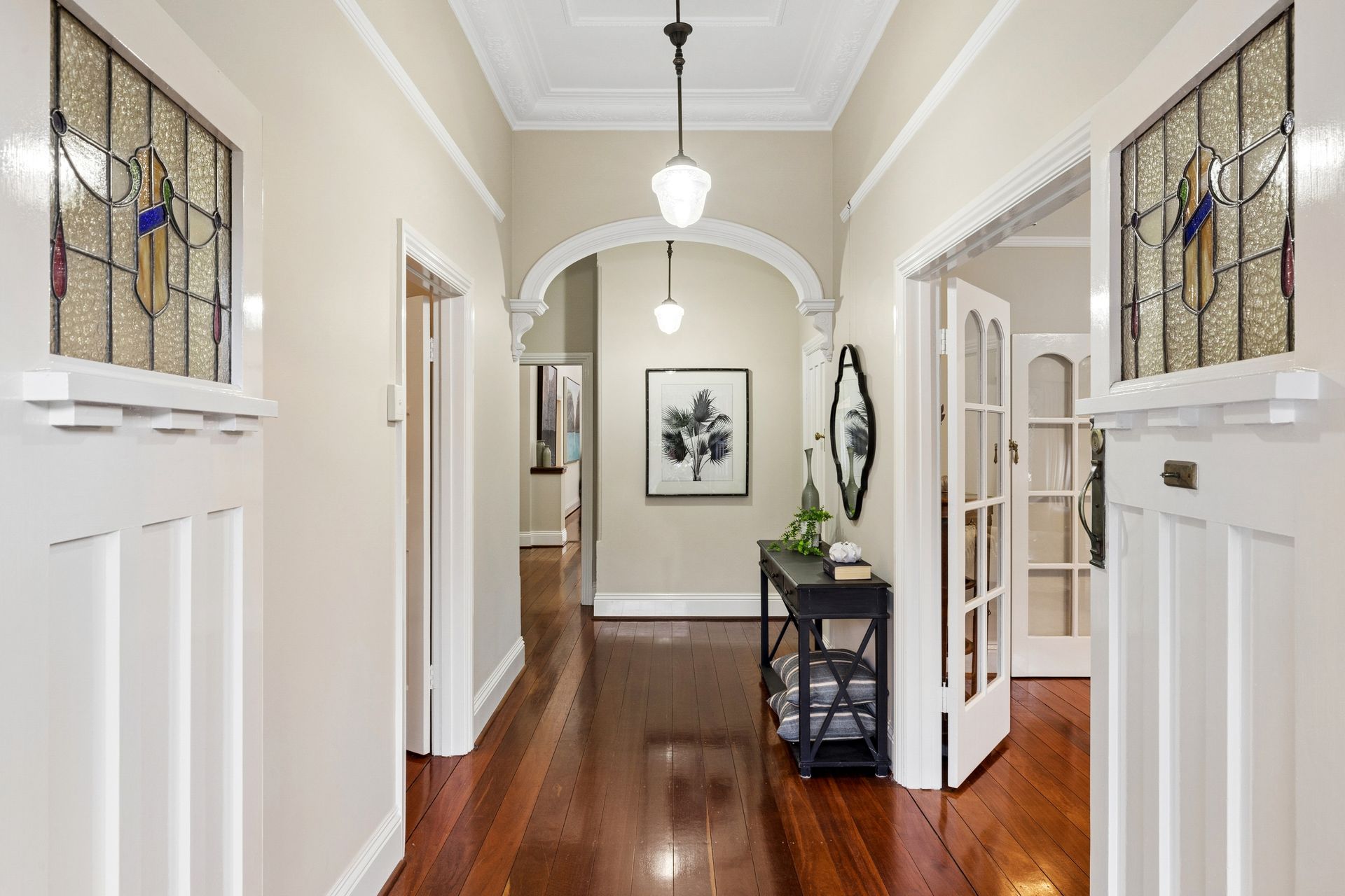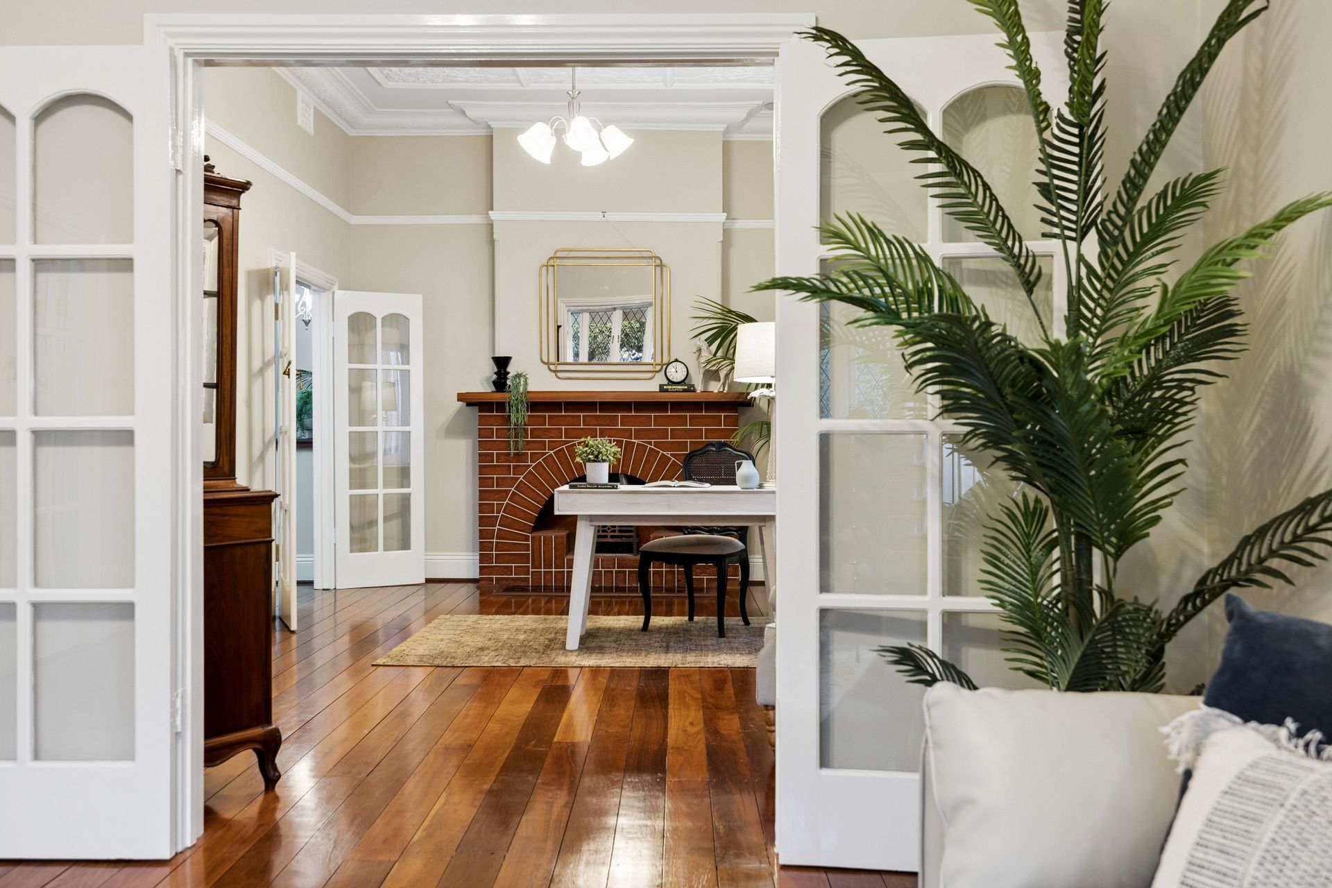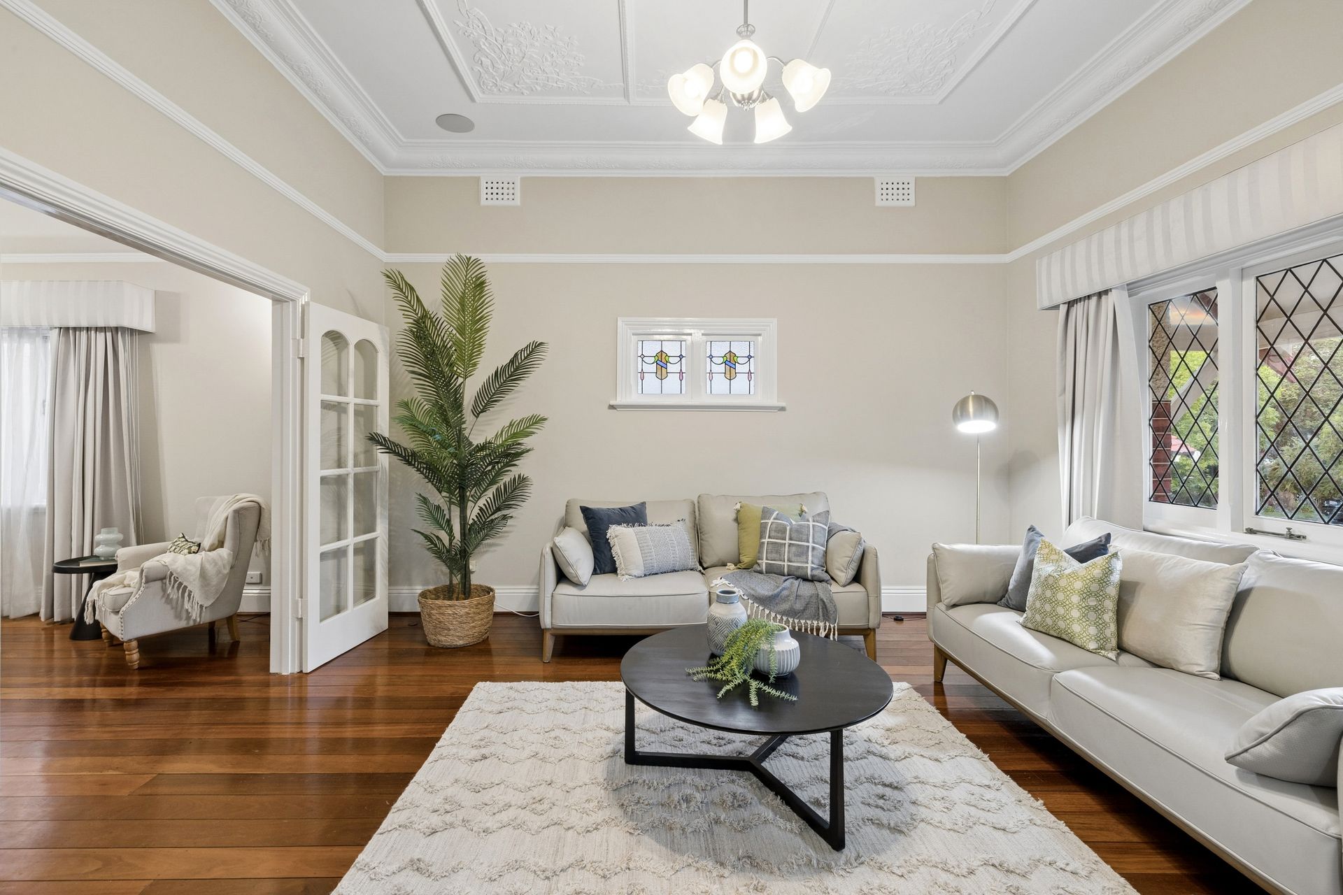 • Formal living areas with ornate ceilings and stunning wide-board floors.